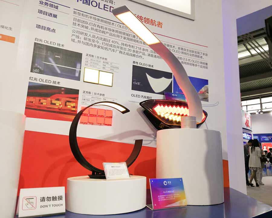 走进CITE主题馆的1D130展位会看到成熟的OLED照明技术发展现状:翌光科技工作人员先从技术原理、制作工艺、生产环境等方面详细的向参观者讲解,再向大家展示白光OLED照明屏体、红光OLED照明屏体产品,以及OLED照明屏体在家居照明与车载照明方面的研发应用。