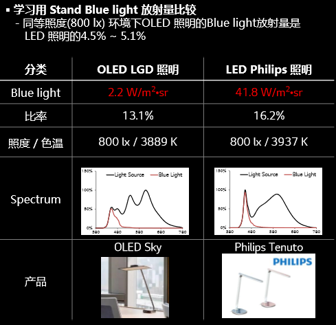 同等照度环境下OLED 照明的蓝光放射量是LED 照明的4.5% ~ 5.1% 。OLED照明可以在提供高品质光源的同时改善照明环境。
