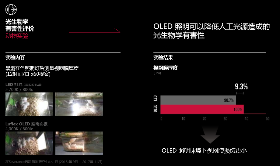 OLED照明可降低人造光源造成的光生物有害性。以下实验数据完美的证明了这一说法~60天每天照射12小时后,通过测量暴露在各照明灯下动物视网膜的厚度,OLED照射下的视网膜厚度未发生变化,而LED则损伤了9.3%。