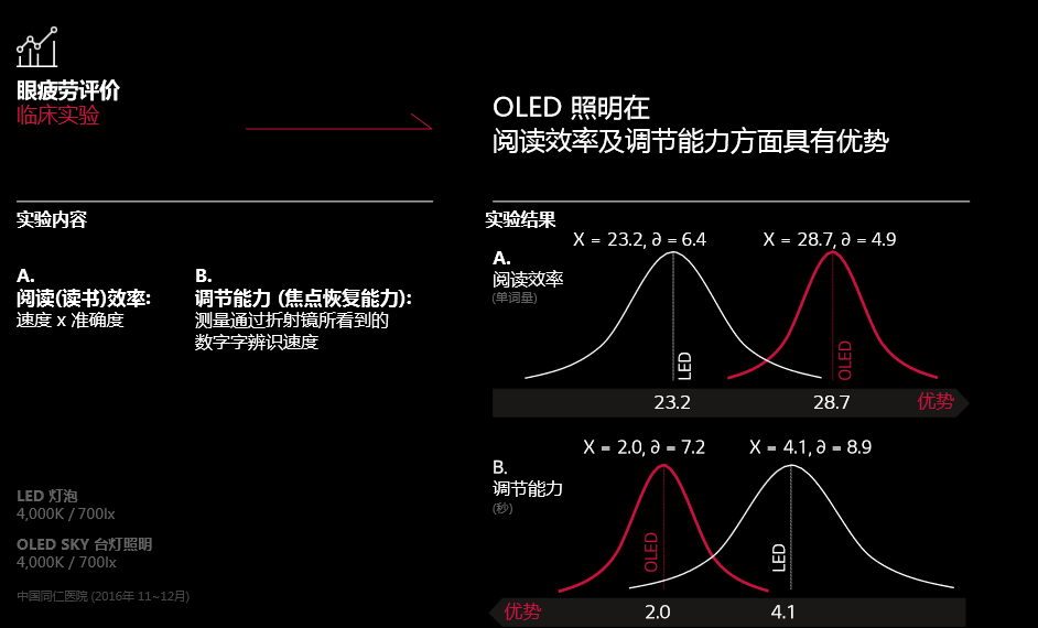 对比相同色温和光通亮下的LED和OLED光源,通过测量折射镜下所看到数字的辨识速度,OLED 照明表现出在阅读效率及调节能力(焦点恢复能力)方面完胜LED光源~