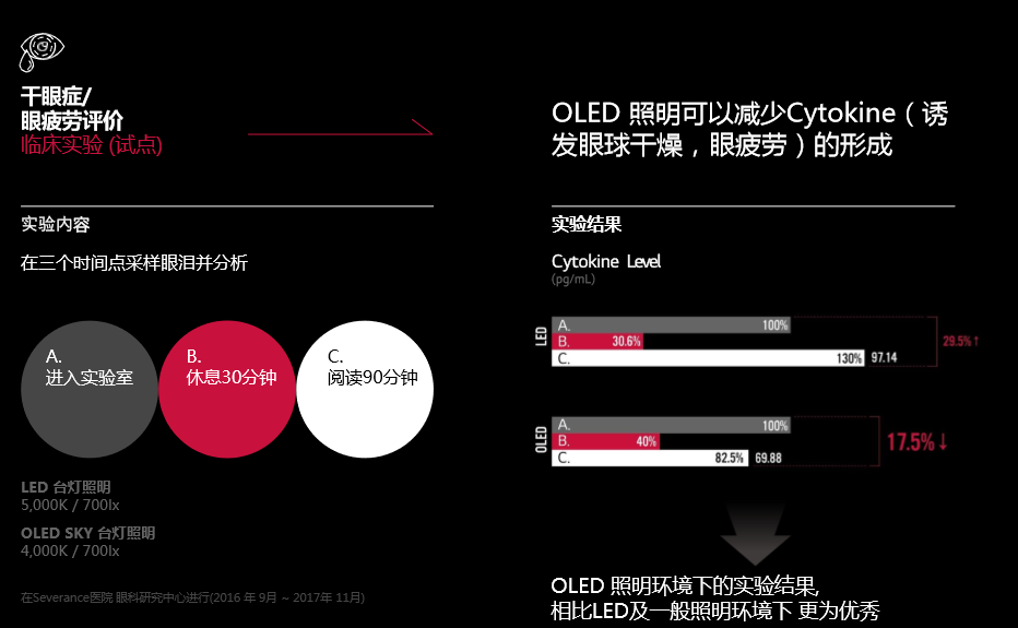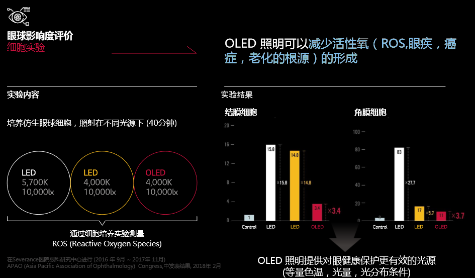 OLED照明可以减少Cytokine(诱发眼球干燥,眼疲劳)的形成,以及减少活性氧(ROS、眼疾、癌症的根源)的形成。对此有了以下针对性的临床试验和细胞实验。实验结果一目了然~OLED照明下的试验结果比LED及一般照明环境下表现更为优秀。