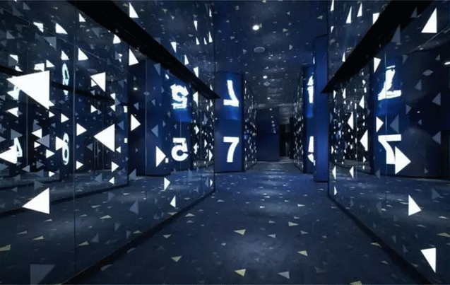 特别是在廊道空间里,选用了近年来流行的OLED灯源作为三角形元素的展现核心,交互组合,搭配镜面产生的反射与延伸效果,让整个空间显得科技梦幻。当人们行走在此,就像是沐浴在月光下的树林中,整条光廊的奇幻风格让人们领略到光与影的魅力。