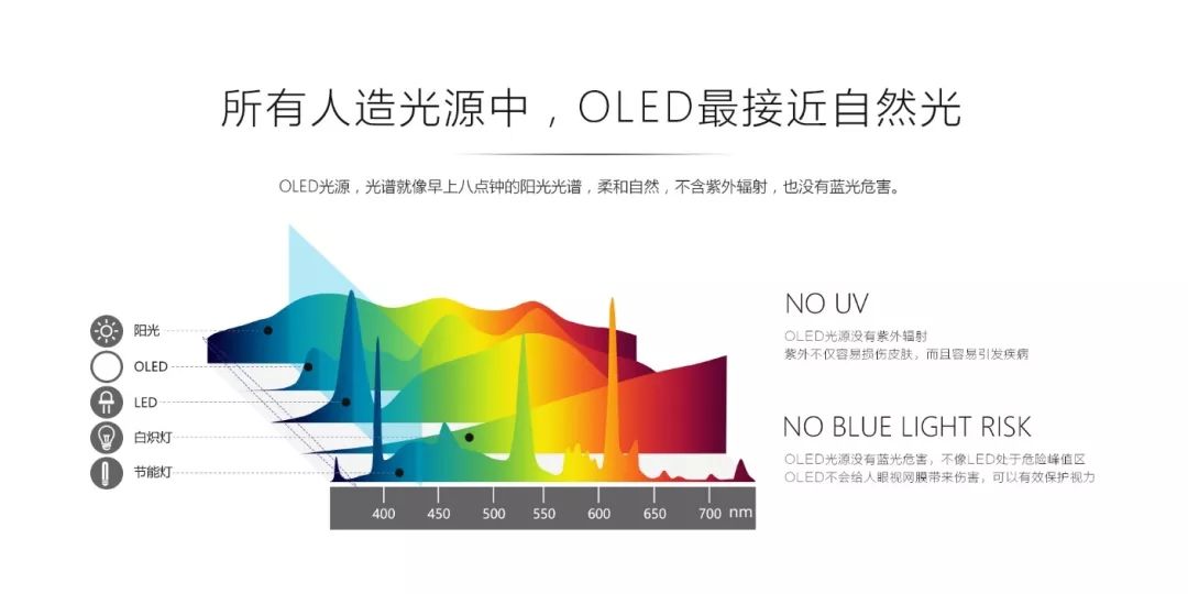 众所周知,有害蓝光产生的自由基,会使视网膜造成光化学损伤从而伤害视力。而OLED的光谱最似早上八点钟的阳光光谱,但不含紫外、红外辐射,也无蓝光危害。所以不需要像其他光源一样,寻找各种避免蓝光危害的外力措施,本身就不会产生任何蓝光危害。OLED台灯向你的告白:永远守护你眼中的星辰。