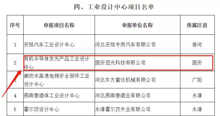 日前,廊坊市工业和信息化局发布《关于2020年廊坊市支持工业设计发展拟奖补项目(第一批)评审结果》的公示已完成,由固安翌光科技有限公司作为依托单位建设的“有机半导体发光产品工业设计中心”通过认证。