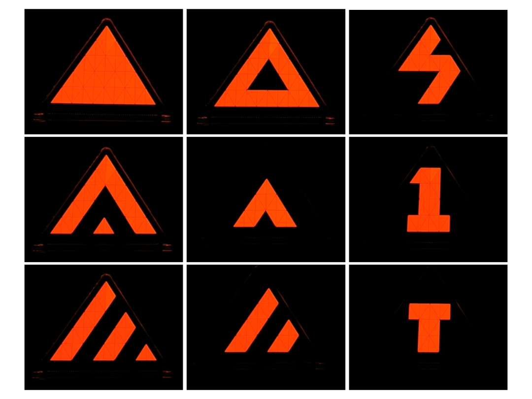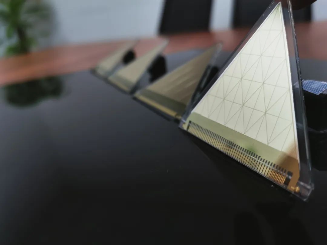 翌光科技OLED数字化光源,光源采用50个相同面积的子发光单元,子发光单元为直角三角形,面积为19mm2,发光单元之间的间隙为0.15mm。子发光单元的大小、形状与位置都由光刻进行控制,图形的光刻精度在10微米以下。每个子发光单元可独立控制,因此可显示各种交互图形,如警告标志、警示标识、字母、数字等,从而实现更复杂信息的交互。