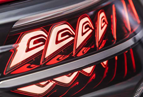 该款OLED车灯包含上下共14片OLED屏体,每片OLED屏体分为两个发光区,两个发光区独立点亮的设计诠释了电动理念,依次点亮的发光方式则给人一种充满飘逸的律动感,且可实现迎宾、充电等模式状态。