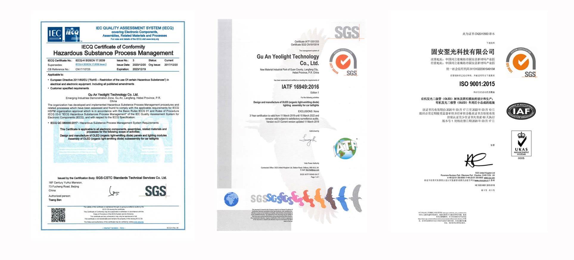 其次,翌光科技位于河北省廊坊市固安县的研发与生产基地,先后通过了ISO9001、QC080000以及IATF16949的体系认证。针对红旗H9使用的OLED光源模组,翌光从供应商审核开始,对物料进厂检验、生产过程、出厂前功能与外观检测,以及到客户端组装的全过程,进行了严格的管理,以保证产品过硬的品质。