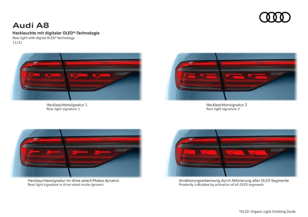 与驾驶辅助系统相结合,数字OLED尾灯有靠近指示功能:如果另⼀辆⻋从后⽅驶向静⽌的 A8,当距离⼩于两⽶时,所有的OLED光段都会被激活。附加功能包括动态转弯灯、回家流水灯和离家流⽔灯。
