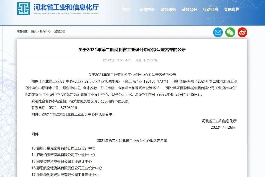 日前,河北省工业和信息化厅发布《关于2021年第二批河北省工业设计中心拟认定名单的公示》,“翌光科技有限公司工业设计中心”顺利通过认定。