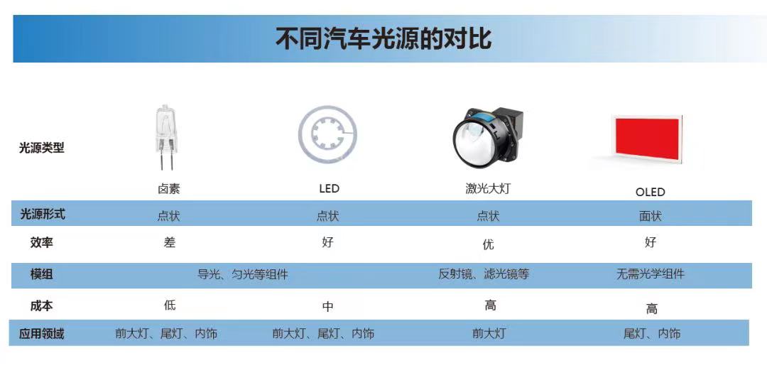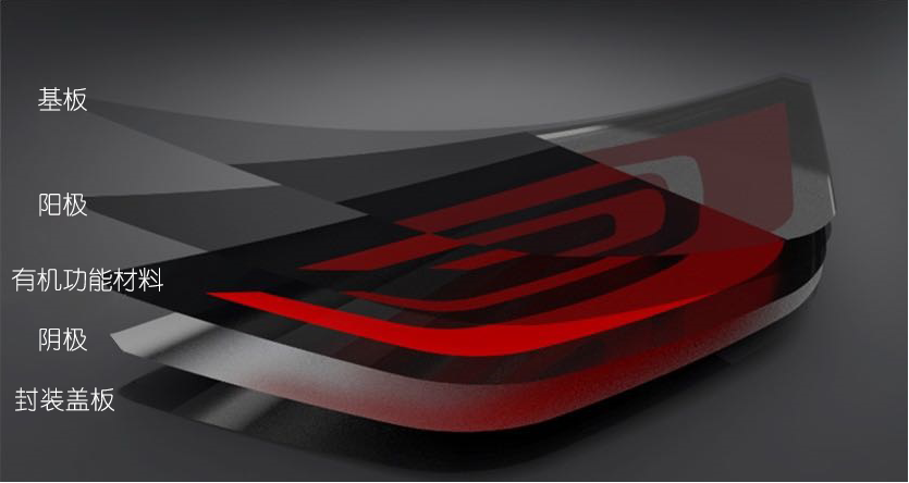光源作为车灯的重要设计元素,其特征、形态一定程度上提升了车灯的外观与功能。OLED光源是一种面光源,其发光均匀、无热量集中点、发光区可分区控制、对比度高、分区之间的间隙极小,可实现弱显示功能。OLED还具有轻薄、易集成的特性,屏体厚度小于2mm,质量更轻,重量相较其他光源减轻50%且无需匀光板,组装更为简单,空间占用减少80%。