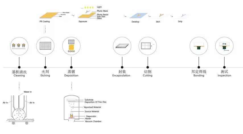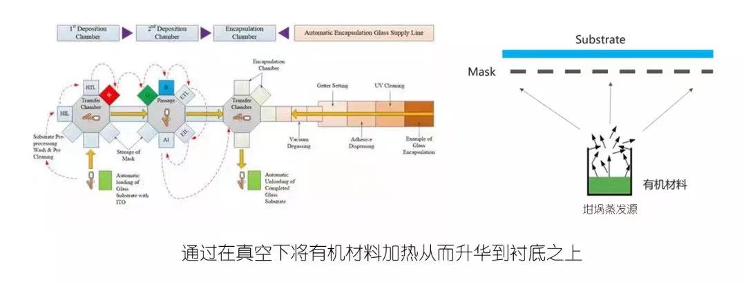 有机功能材料:采用小分子有机材料,通过不同材料的搭配(十余种有机材料)调整OLED的发光颜色、寿命等。一般通过热蒸镀的方式逐层沉积而成。