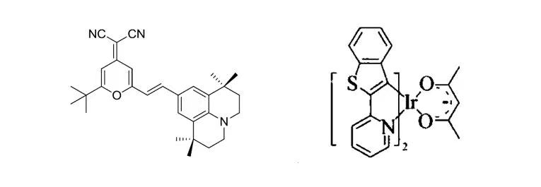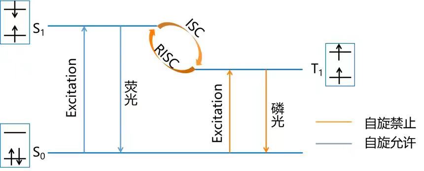 荧光材料受激辐射会由单重激发态跃迁到基态,从而形成荧光发射。但基于泡利不相容原理以及量子力学的选择定则,在荧光材料中从三重激发态跃迁到基态的过程是自选禁止的,且由于在器件中形成单重激发态和三重激发态的比例为1:3,所以在一般荧光材料体系最高内量子效率只有25%。为了突破25%的效率限制,在有机材料基础上引入重金属元素(如Ir、Pt等),通过重原子效应可以使电子三重激发态跃迁到基态,从而发射出磷光,且最高内量子效率可以达到100%。