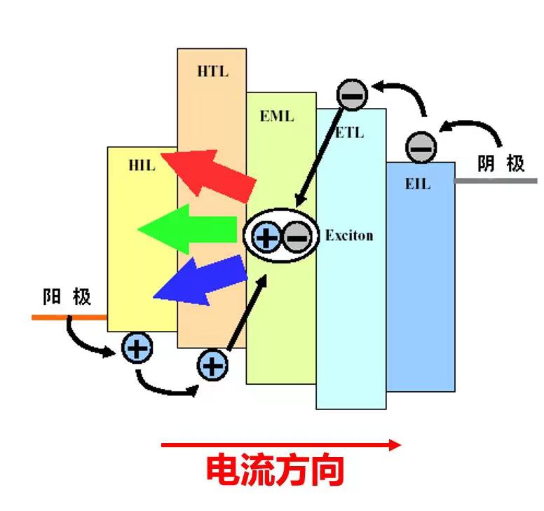 OLED (organic light emitting diode):有机发光二极管,是一种基于有机材料的电致发光器件。其发光原理如下: