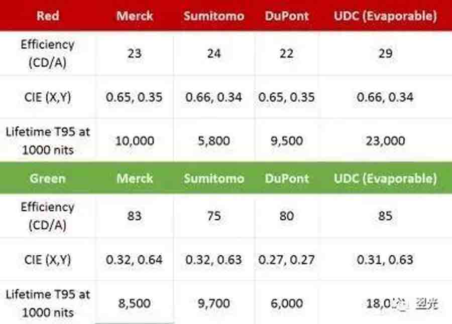 从图中可以看出,红光方面,UDC蒸镀型材料在寿命及效率方面较其他湿法材料拥有明显的优势;绿光方面,UDC蒸镀型材料与湿法材料的效率差距很小,但寿命差距依然较大。